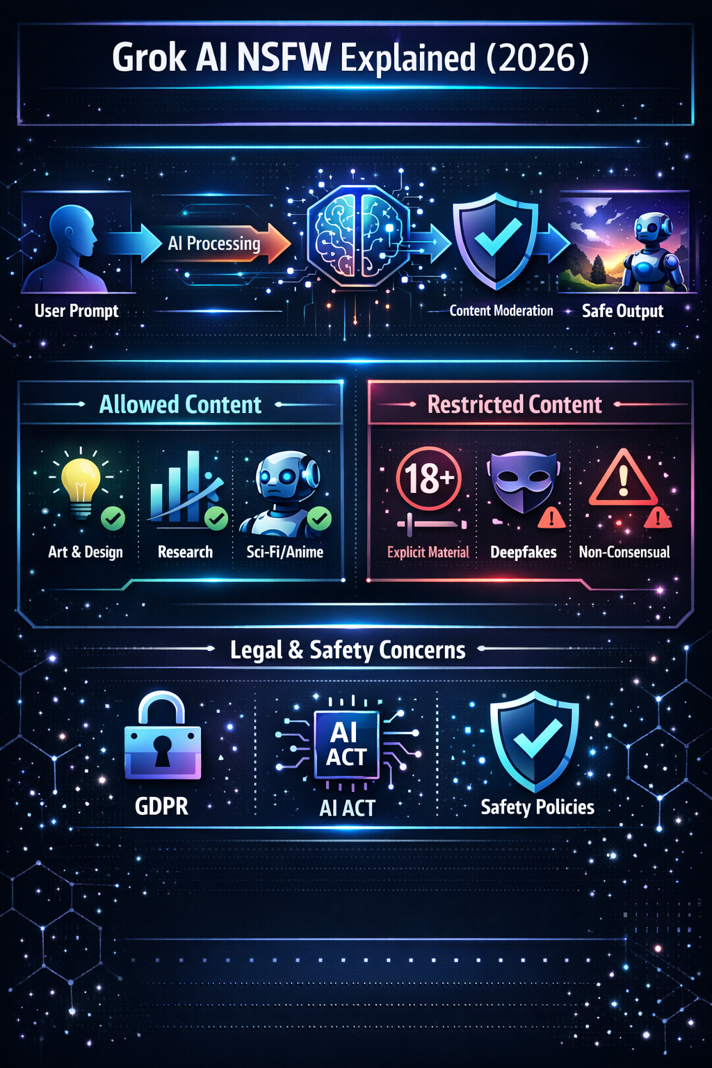 Grok AI NSFW content policy infographic showing moderation process, restricted content types, legal risks, and safe AI usage guidelines in 2026